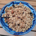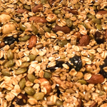 Home made granola that is easy to make. Sweet and crunchy, protein and fiber rich, eat as is or topped on yogurt or cottage cheese, or in a bowl with milk.