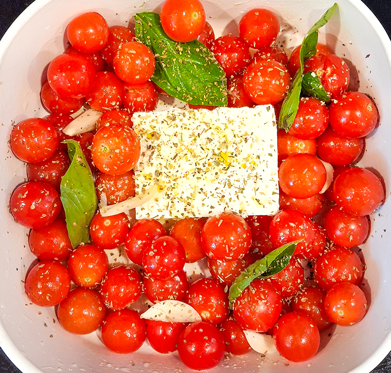 - After feta-tomato bake is done, remove from oven and let sit 10 minutes.